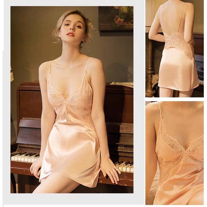 STYLE NO. : P021 固定墊蕾絲露背睡裙/粉/黑/M-L